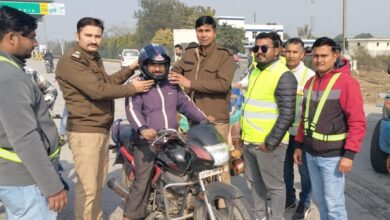 यातायात नियमों के प्रति वाहन चालकों को जागरूक कर रही हाफिजपुर थाना पुलिस और हेलमेट वितरण भी किए